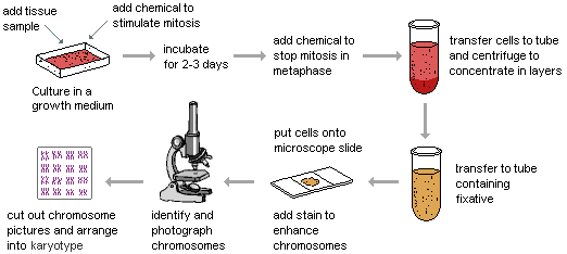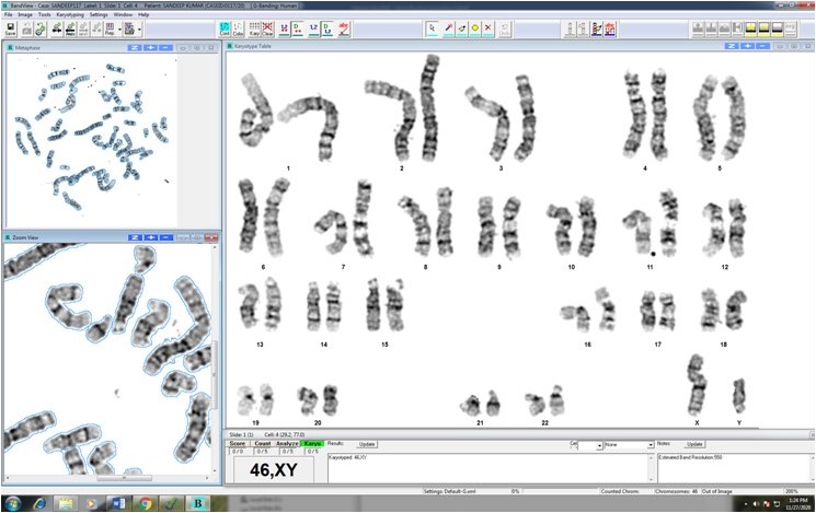 Duplicate cultures are initiated for each blood sample/ other sample types received for chromosome analysis (karyotype). Blood lymphocytes are cultured in complete media supplemented with the mitogen, phytohemeagglutinin (PHA) to divide and cultured for 72 hours routinely.Conventional Cell Culture Techniques followed by G-banding Chromosomes analysis through Bright Field Microscopy for detection of numerical and structural chromosome abnormalities including balanced and unbalanced translocations through GenASIs Bandview software from Applied Spectral Imaging (ASI).