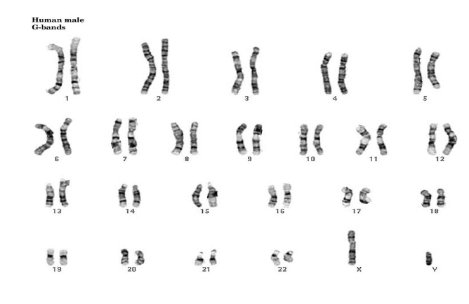 Figure 1: Chromosomes are stained and photographed for study and depicts 23 pairs or 46 chromosomes (each pair contributing 1 chromosome from father and 1 from mother) including pair of sex chromosomes with male showing one X chromosome and one Y chromosome (Normal Male Karyotype: 46, XY.