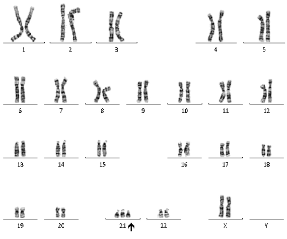 Figure 2: Abnormal Karyotype of child showing Trisomy of chromosomes #21 (Downs Syndrome) due to extra copy of chromosome 21. (Abnormal Female Karyotype: 47, XX, +21).