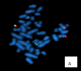 Figure: (A) Metaphase FISH for detection of BCR-ABL gene fusion (B) Interphase cell showing FISH signal with 1 F, 2 R, 1 G signal for BCR-ABL gene in chronic myeloid leukemia (CML) patient.